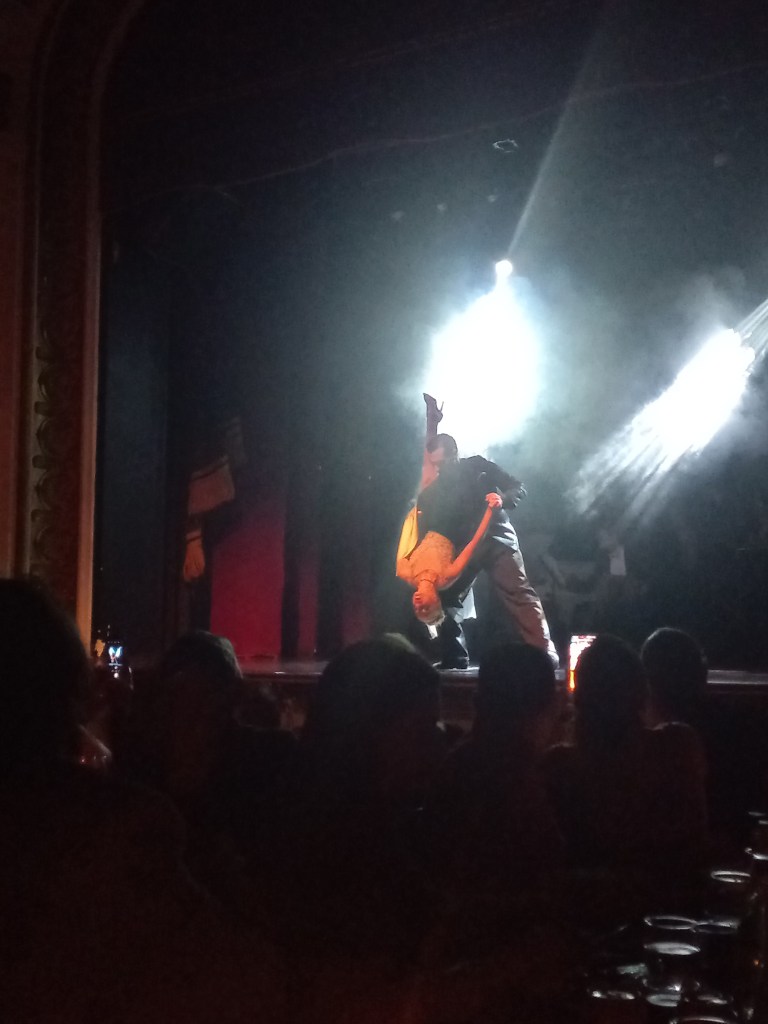 Después de la clase, nos trasladamos al Teatro Astor Piazzolla un teatro inaugurado en 1915, un lugar igualmente cautivador donde nos esperaba una cena-show con más de 22 artistas en escena entre músicos, bailarines y cantantes. La combinación de una velada gastronómica y el arte del tango parecía prometedora, y no nos decepcionó. La decoración del teatro, con su aura íntima y acogedora, creó el ambiente perfecto para disfrutar de la velada que se avecinaba.